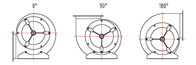 ADF系列外轉子風機制成整體結構,風機可分為左旋和右旋兩種,即從電機出線一側正視,葉輪逆時針旋轉稱為左旋,葉輪順時針旋轉稱為右旋。用戶訂貨時須注明風機旋向。ADF系列外轉子風機可制成0°、90°、180°三種常規角度(如下圖所示),也可按客戶要求制成任何安裝角度。