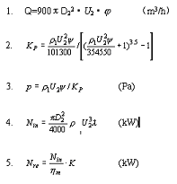 風機性能一般均指在標準狀態(tài)下輸送氣體的性能。標準狀態(tài)指大氣壓Pa=101325Pa,大氣溫度t=20℃,相對濕度50%,空氣密度ρ=1.2kg/m3。性能表中性能均指調(diào)節(jié)葉片為0°(調(diào)節(jié)門全開)時風機的性能。