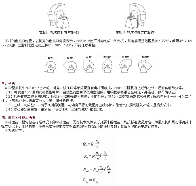 風機可制成右旋轉和左旋轉兩種型式,從電動機一端正視,葉輪順時針旋轉,稱為右旋轉風機,以“右”表示;葉輪逆時針旋轉,稱為左旋轉風機,以“左”表示。